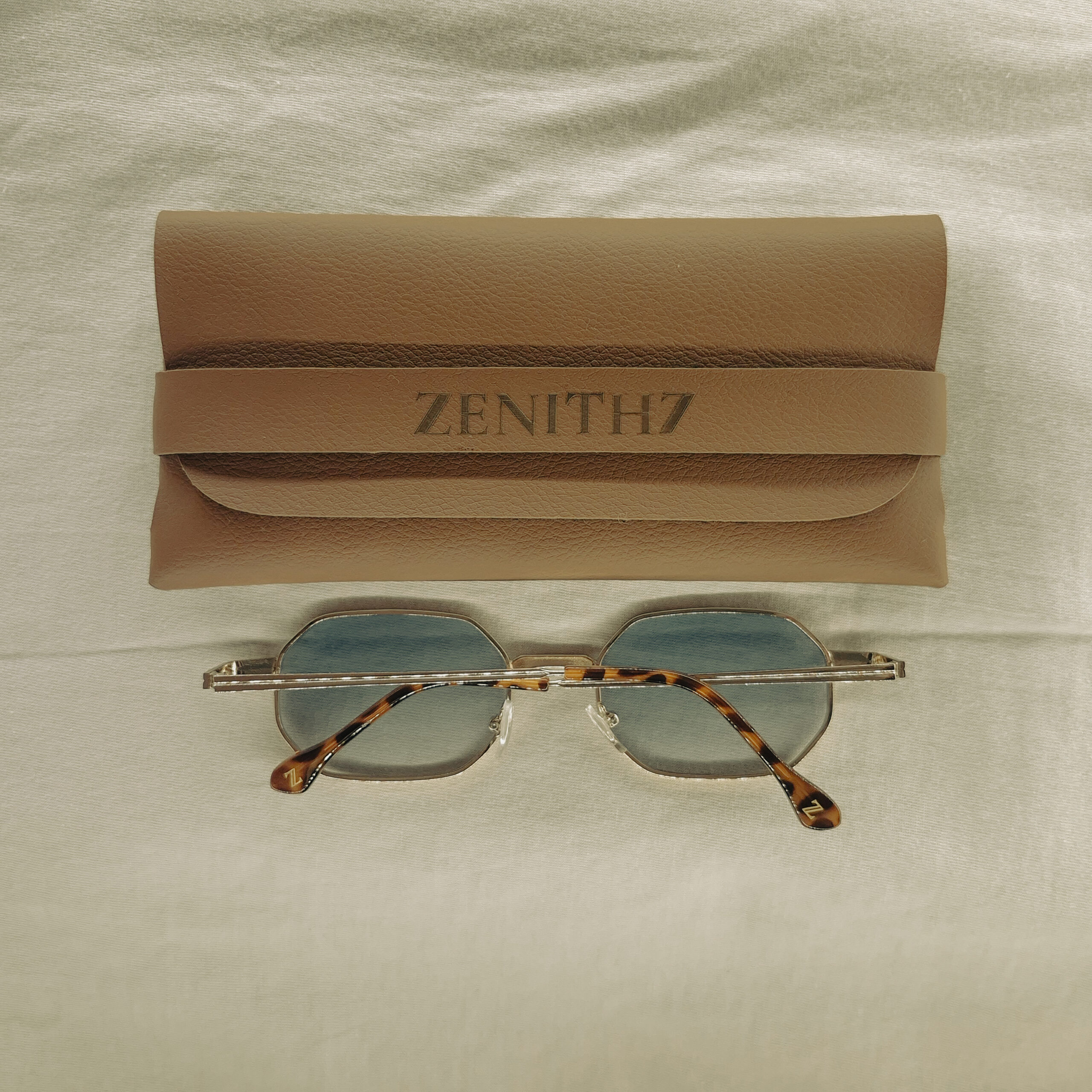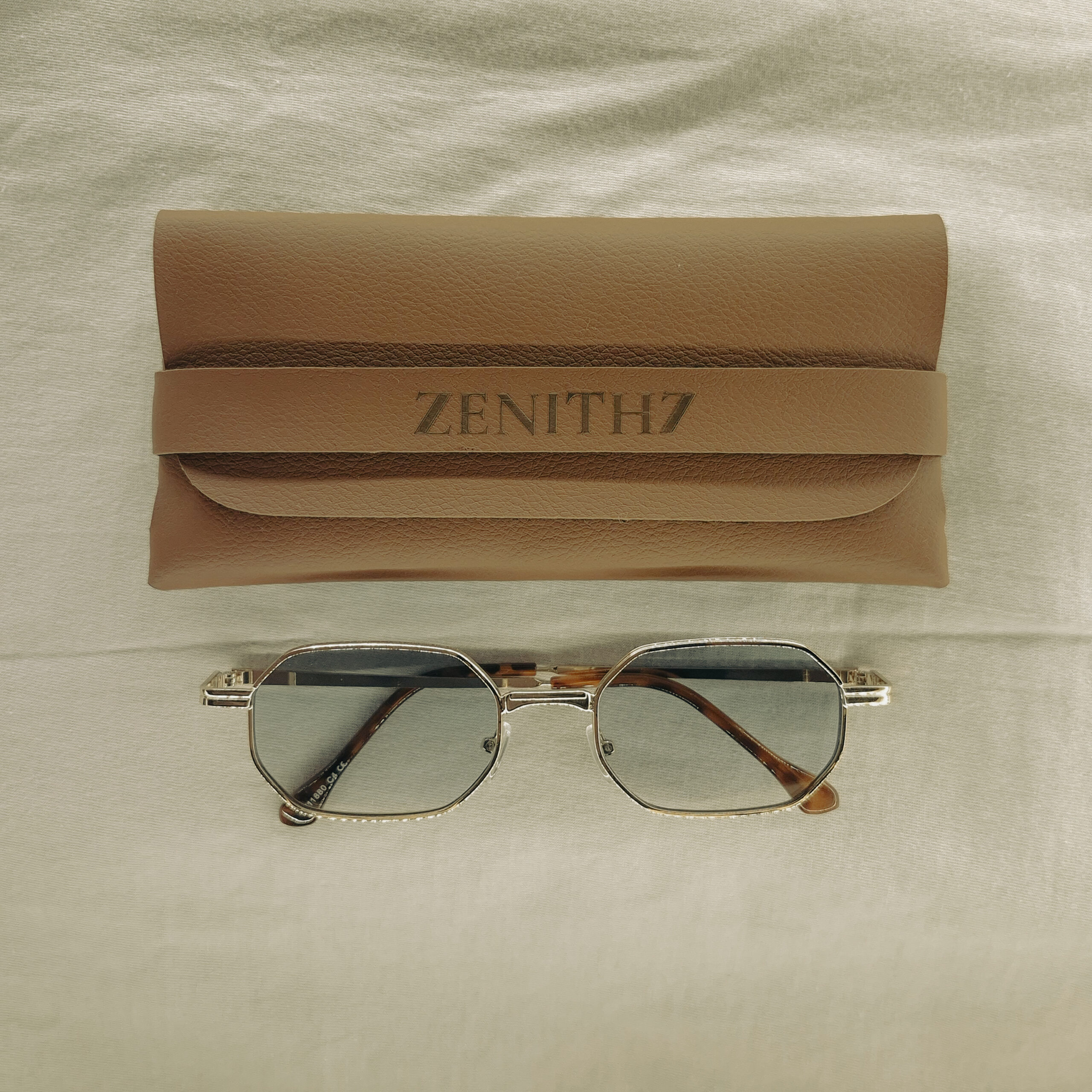 Óculos de sol com armação metálica fina e lentes em formato hexagonal.
